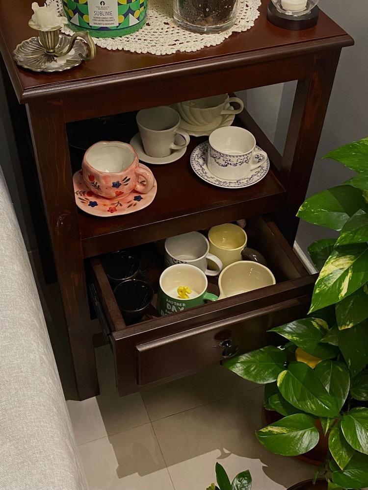 - أرفف متعددة الاستخدام: سطح علوي لترتيب الشموع أو الغلاية، ورف سفلي لترتيب فناجينك، ودرج عملي لتخزين أدوات القهوة أو الأكياس.
