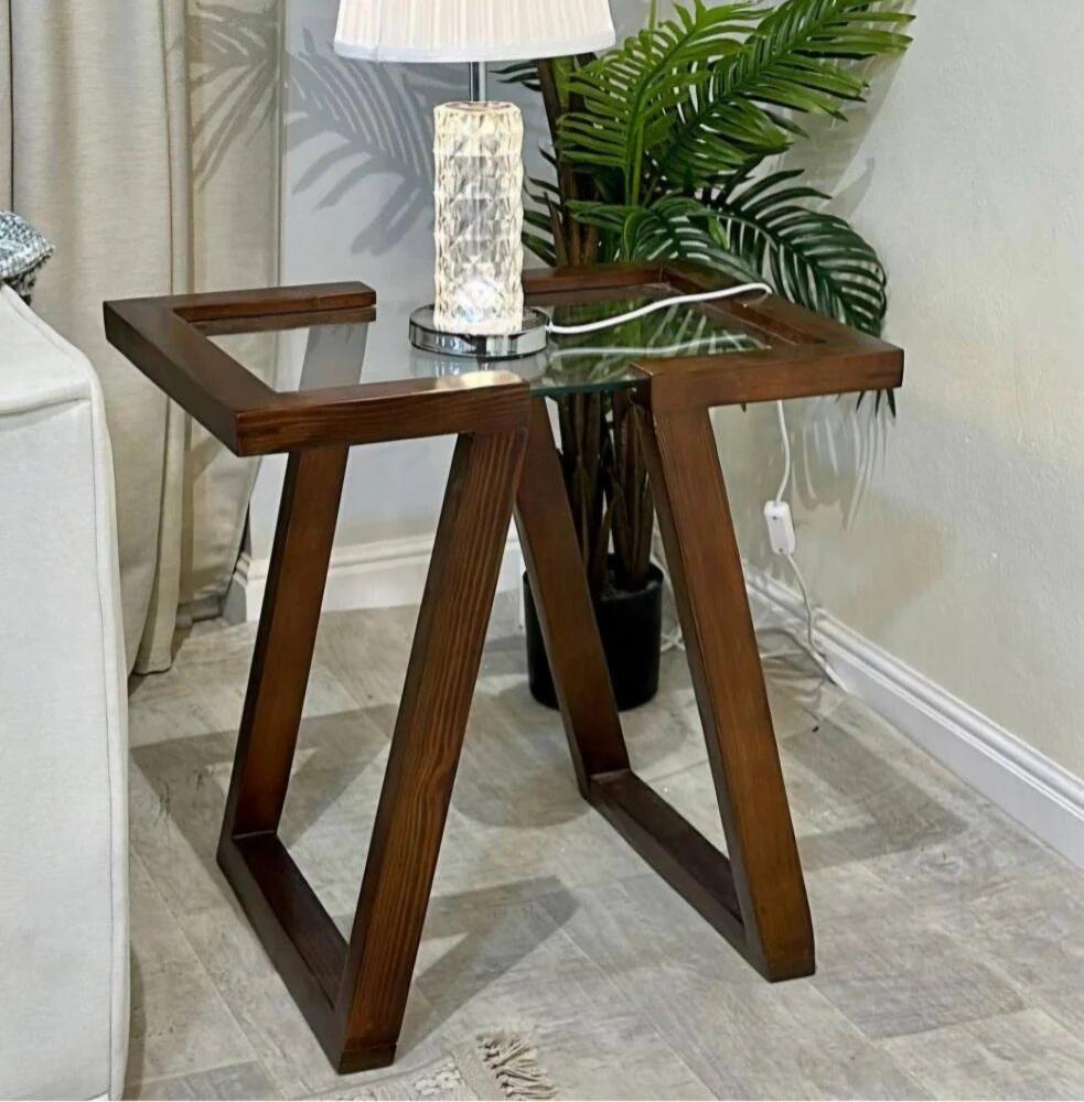 - تصميم خشبي هندسي مائل يمنح الطاولة ثباتًا وأناقة