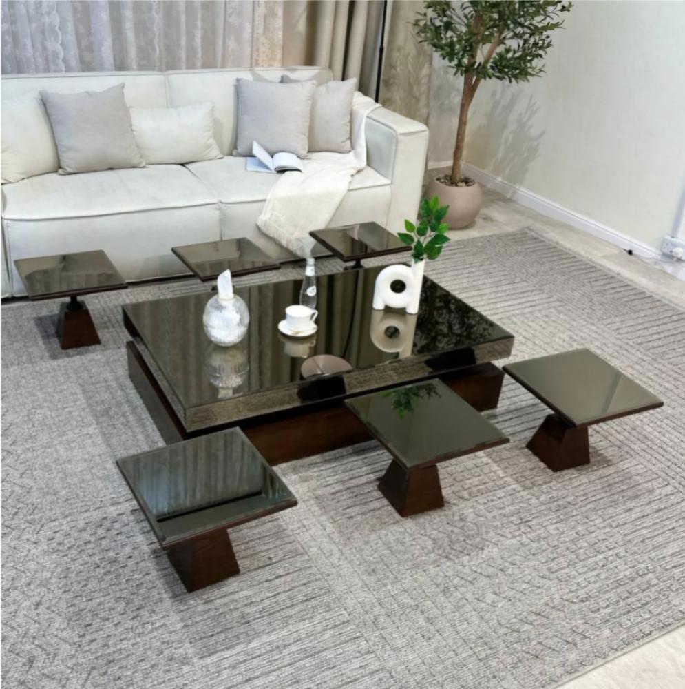 ارتقِ بمستوى الضيافة في مجلسك مع طقم طاولات أرضي سطح مرايا بتصميم عصري أنيق ومتكامل. الطاولة الرئيسية تأتي بسطح عاكس فخم، محاطة بـ 6 طاولات خدمة أنيقة تُسهل عليك ترتيب وتقديم الضيافة بكل مرونة وأناقة.