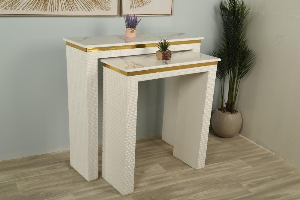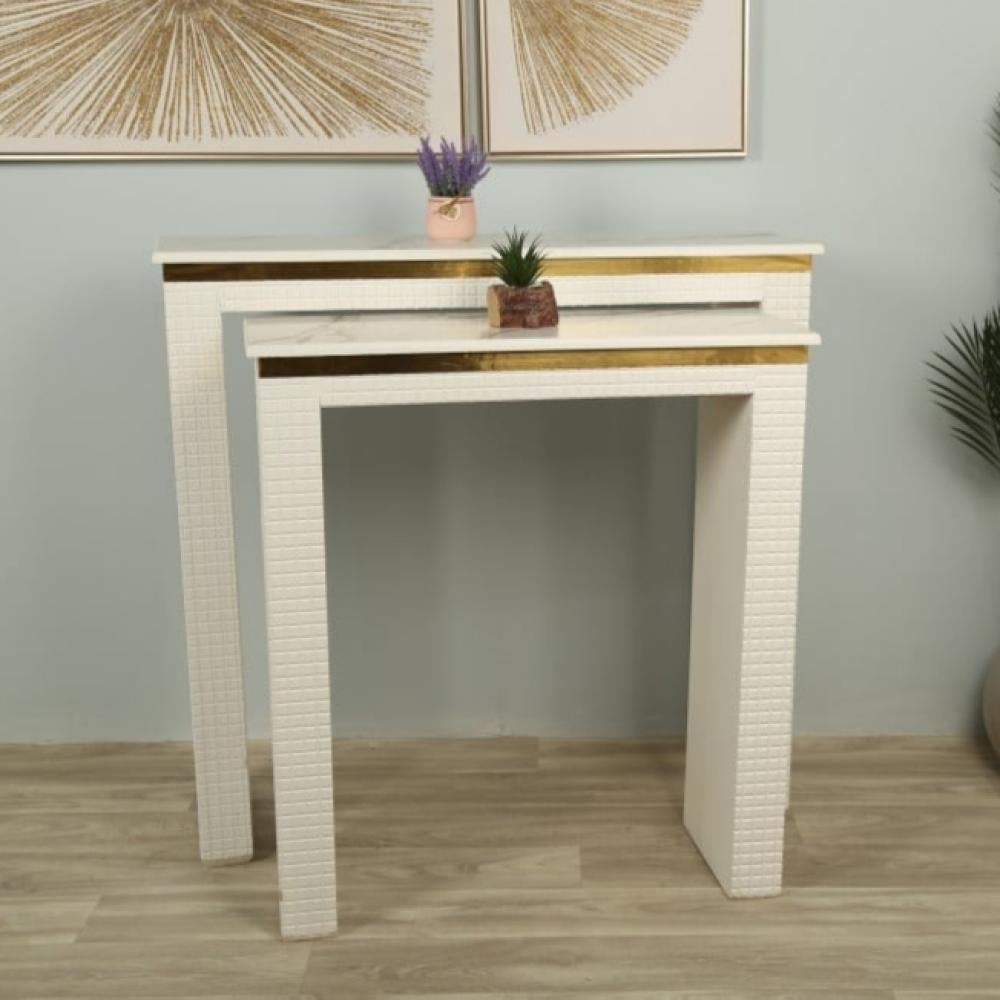 أضيفي لمسة من الفخامة الهادئة إلى مدخل منزلك مع طقم طاولات كونسول خشب أبيض يتميز بتصميم ناعم مزخرف وحدود علوية بلون ذهبي لامع. يضم الطقم طاولتين متداخلتين بتفاصيل راقية تناسب الديكورات المودرن والكلاسيكية، وتمنحك حرية التنسيق بحسب المساحة.