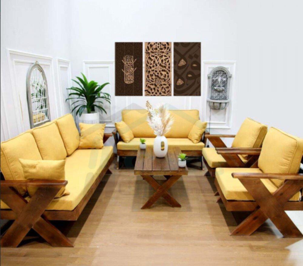 تتألف كراسي جلسات خارجية من هيكل خشبي متين بتصميم تقاطعي مميز، مع وسائد إسفنجية سميكة بلون أصفر يمنح المكان حيوية وأناقة.
